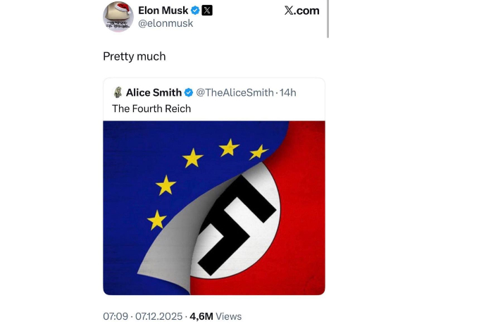 Призвав к роспуску Европейского союза, Илон Маск опубликовал в социальной сети X изображение, на котором поднят флаг ЕС, а на нем — нацистское знамя со свастикой. Автор оригинального аккаунта, некто «Элис Смит», сопроводил изображение комментарием «Четвертый рейх», а Маск ретвитнул его с подписью «практически».